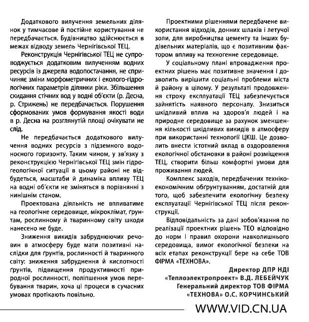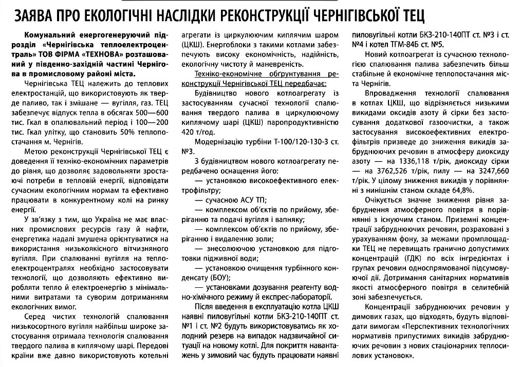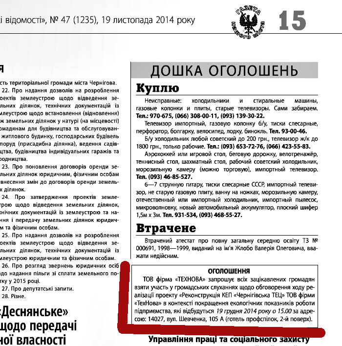 Генеральный директор ООО «Фирмы «ТехНова» Александр Корчинский подтвердил, что в здании гостиницы «Профсозная в 15 часов дня 19 декабря действительно проходили общественные слушания по вопросу экологических последствий, которые могут возникнуть после реконструкцией Черниговской ТЭЦ. Информация о проведении этих слушаний была опубликована в одной из черниговских газет. Получалось то, что мы не знали о проведении слушаний – исключительно наша вина. Нам так и сказали: «Газеты читать надо»…