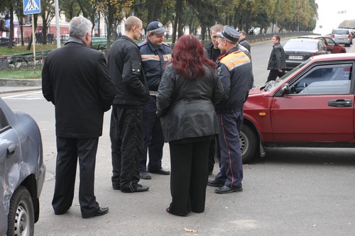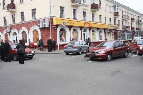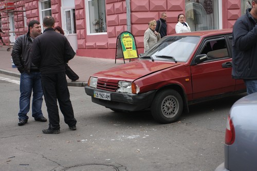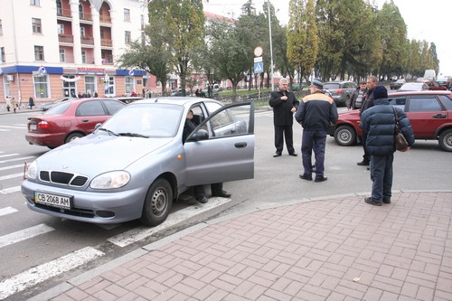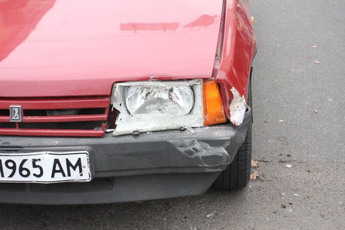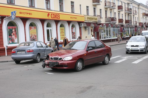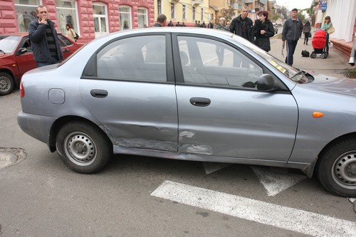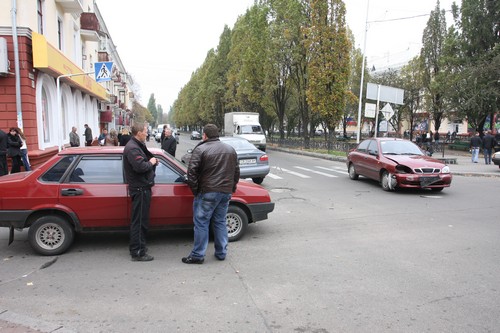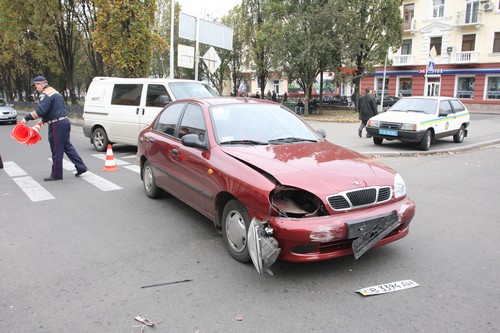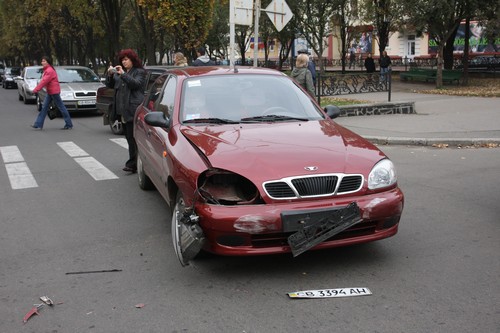Сегодня, 16 октября, около 12.20 дня на перекрестке проспекта Мира и улицы Коцюбинского произошла авария. Столкнулись три автомобиля, из них две машины марки Daewoo Lanos и ВАЗ 21099. Больше всего не повезло вишневому Ланосу – его «фасад» изрядно пострадал при столкновении.