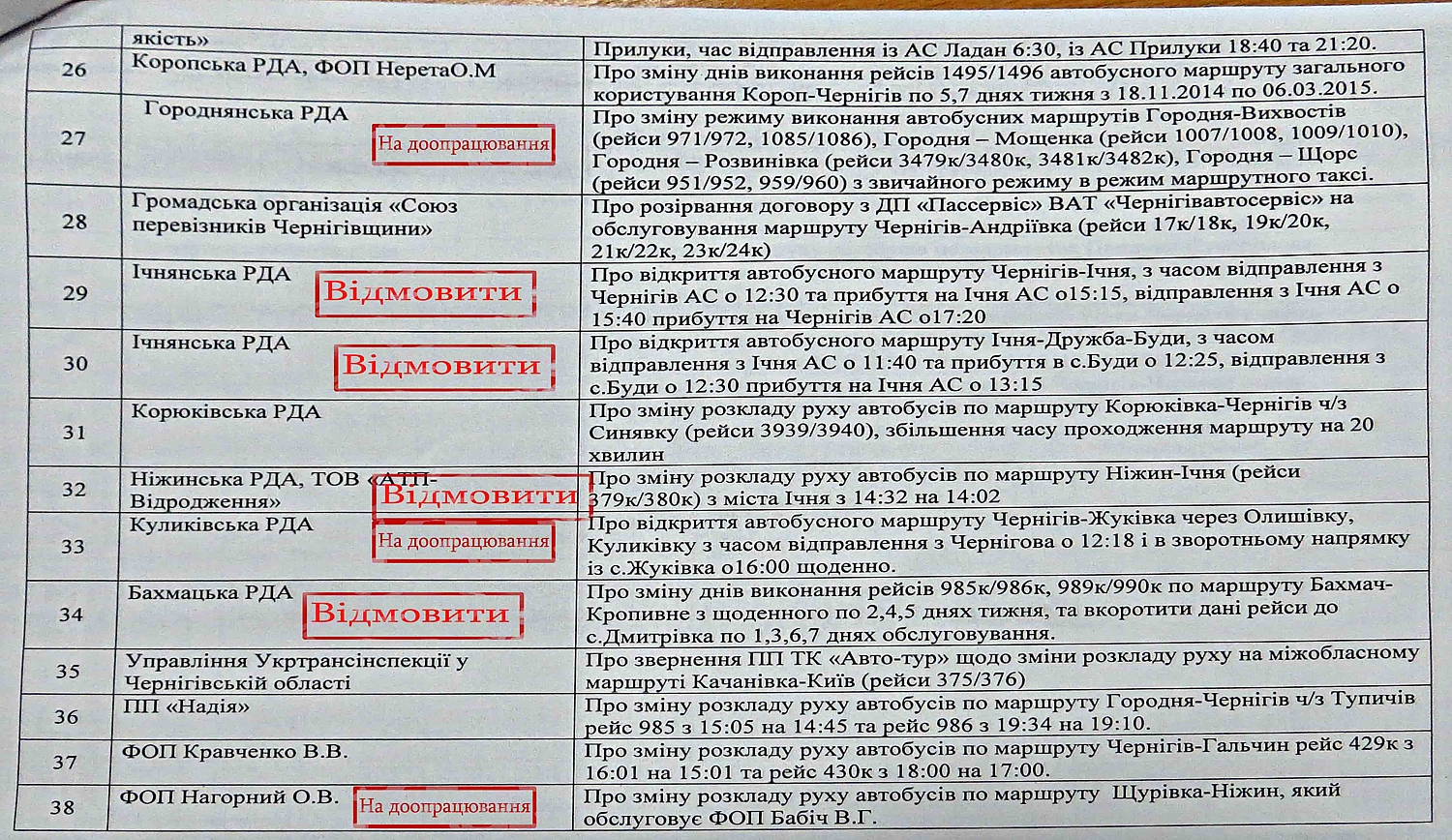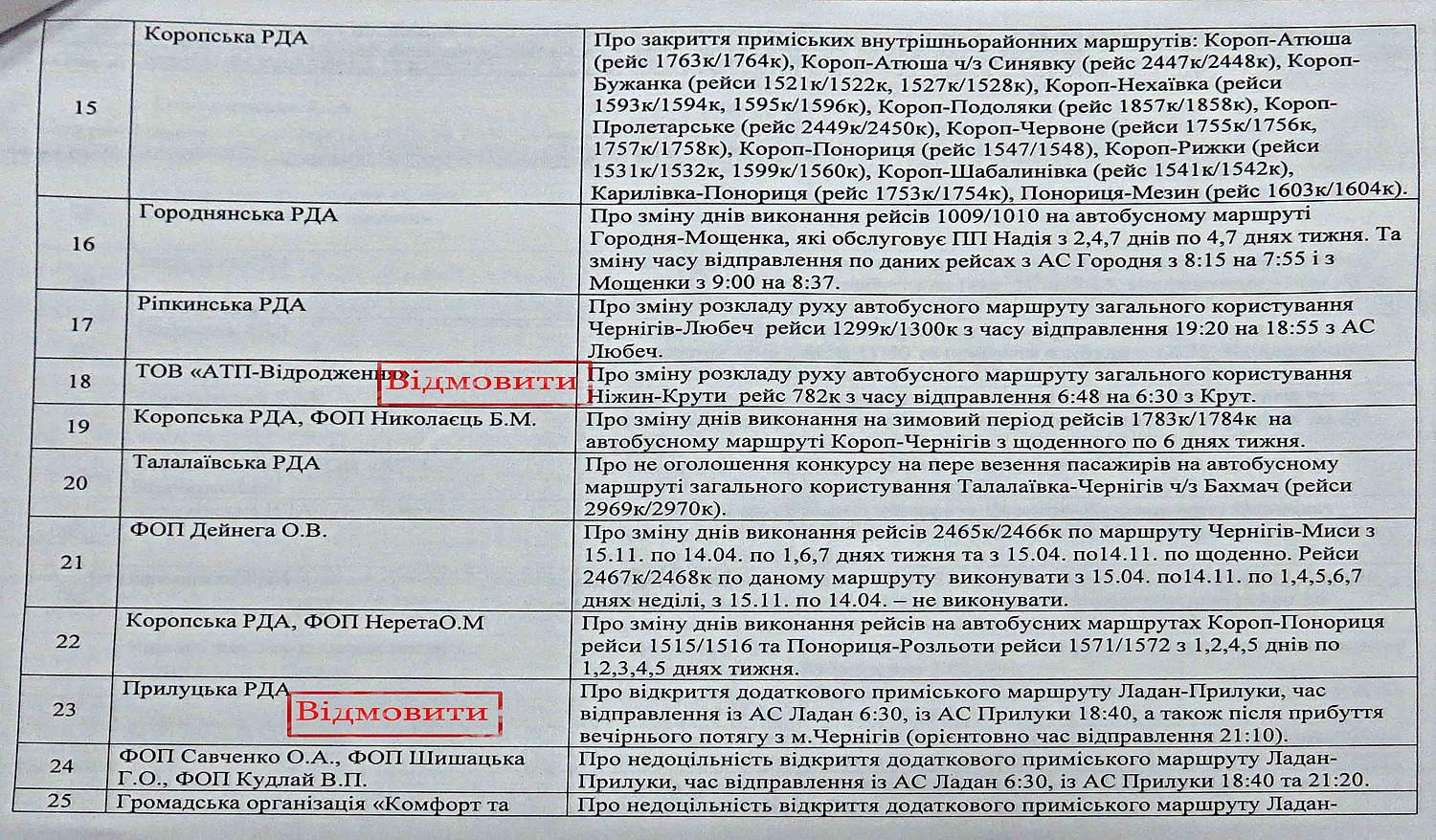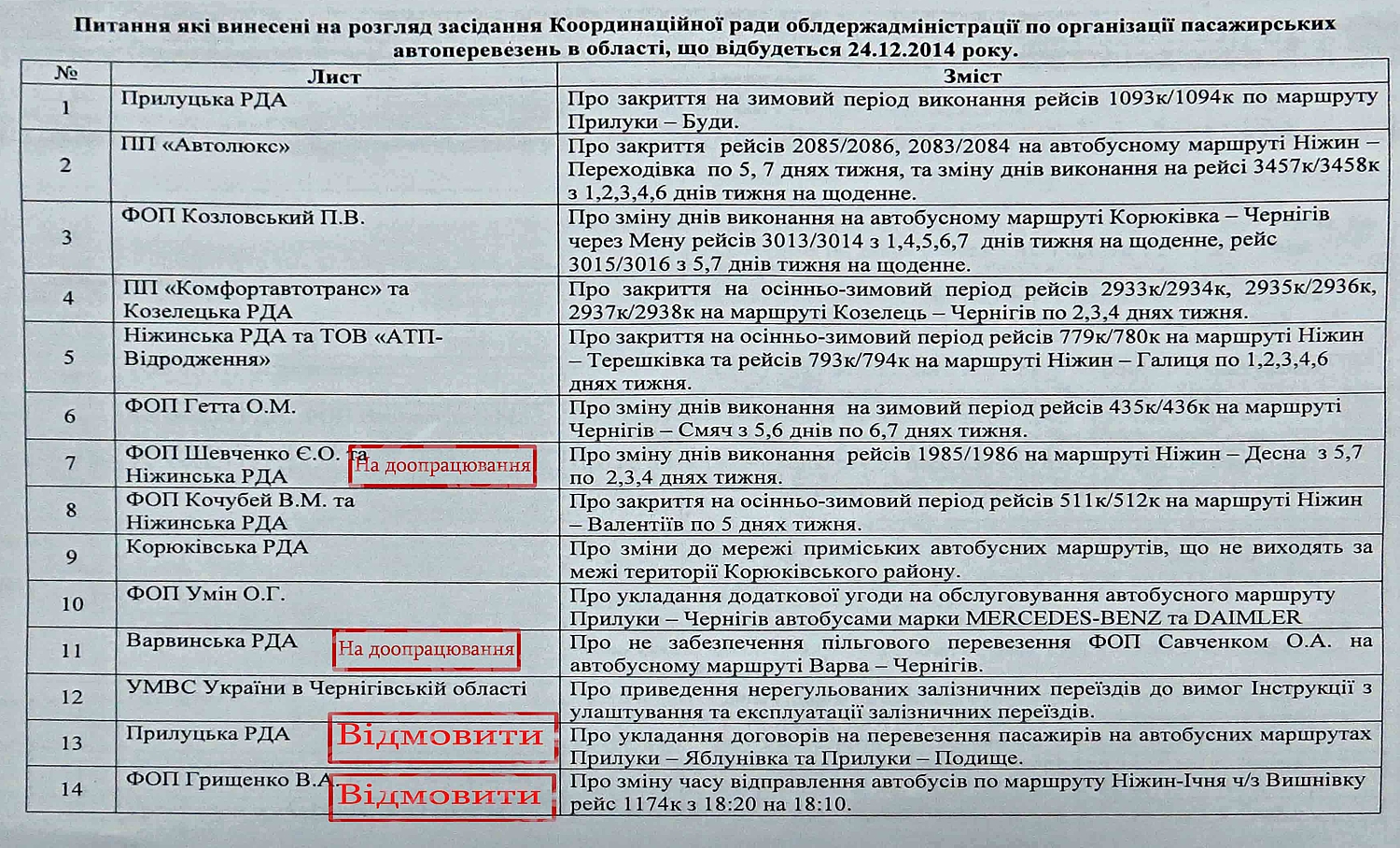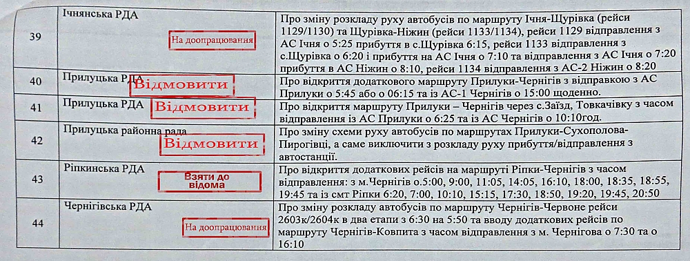 Похоже, что недобросовестная конкуренция приветствуется Ичнянской РГА. Они не только просили открыть два автобусных маршрута фактически впритык к уже действующим, но еще и рекомендовали перевозчика (хотя и временно) на этот маршрут (п.п. 29,30). Координационный совет отказал по двум пунктам.