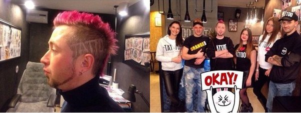— В «Cut mе» занялись моей прической. Немного подкорректировали, выстригли надпись «Тату». Она уже заросла. Затем спросили, чего я боюсь больше всего. Я ответил: не хочу, чтобы меня выкрасили в голубой цвет. И тут мне показывают баночку с голубой краской. Все, трындец, я буду голубым, — вспоминает Александр. — Я сидел спиной к зеркалу. Когда повернулся, оказалось, розовый. И то неплохо, — поправляет выгоревшую розовую шевелюру Саша.