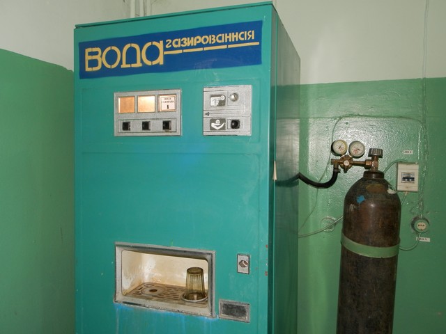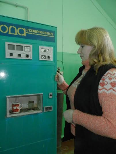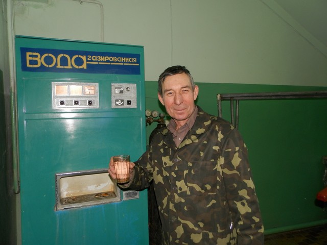 Виктор Ковальчук – слесарь Черниговского УПП УТОГ. Именно он занимается обслуживанием аппарата с газированной водой. Сверху на автомате три кнопки выбора напитка, но выдает автомат только газированную воду. Сбоку подключен баллон с углекислым газом.