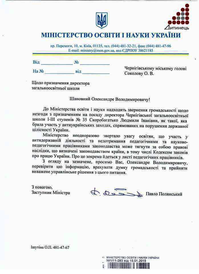 Пізніше стало відомо, що заступник міністра П.Полянський звернув увагу Міністерства освіти і науки України щодо призначення пані Скоробагатько директором школи №35