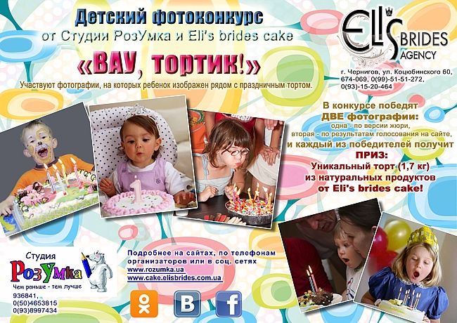Студия РозУмка и Свадебное агентство Eli's brides 12 января объявили начало детского фотоконкурса «ВАУ, тортик!». В конкурсе могут участвуют только те фотографии, на которых ребенок изображен рядом с праздничным тортом.