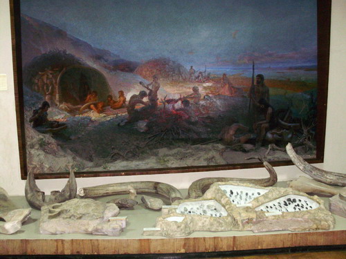 Поднимаюсь на второй этаж. Экспозиция начинается с диорамы «Мезинская стоянка». Впечатляющее зрелище, дающее представление о жизни первобытного человека. Рядом экспонируются кости животных ледникового периода. Далее бронзовый век, где основным занятием населения были — земледелие, скотоводство.