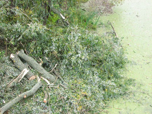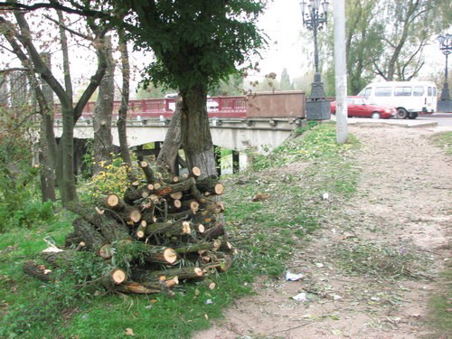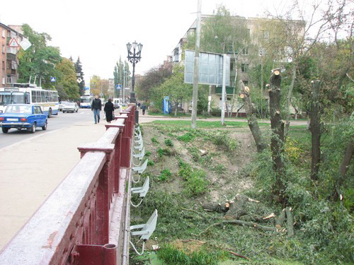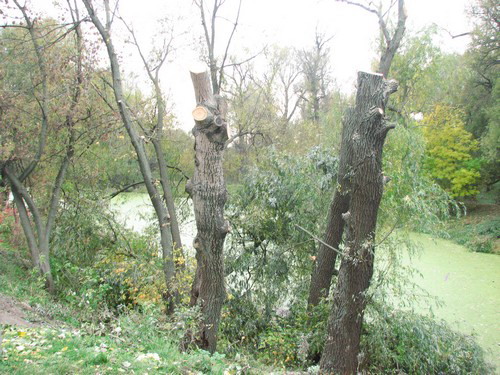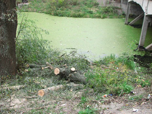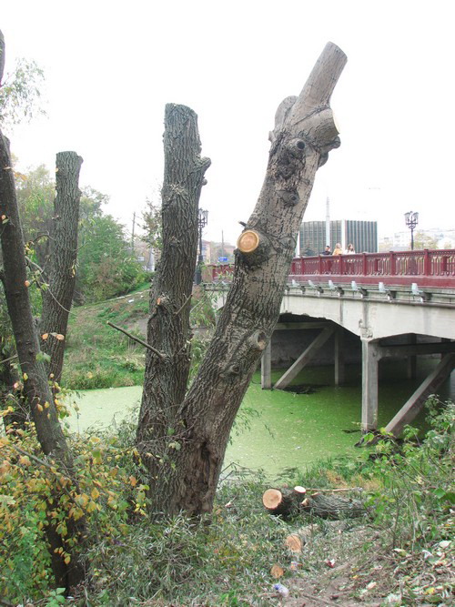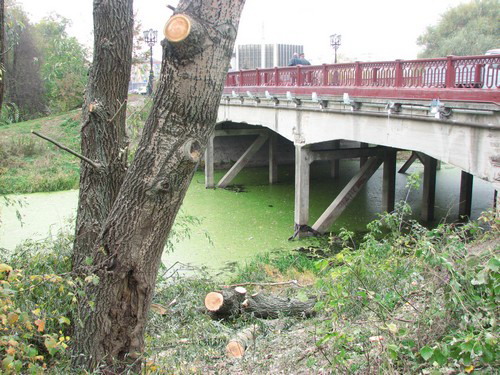 16-го листопада занепокоєний читач повідомив про знищення дерев в районі Красного мосту. Приїхавши туди, «знищувачів» ми вже не побачили, натомість знайшли обрізані чотири стовбури верби прямо над Стрижнем. За вихідні до них додалося ще кілька. Хвилювання виявилося передчасним – навесні стовбури випустять нові гілки. Але питання в іншому – після обрізання гілки з зеленим листям залишилися в воді. Чистішою від того вода в річці точно не стала.