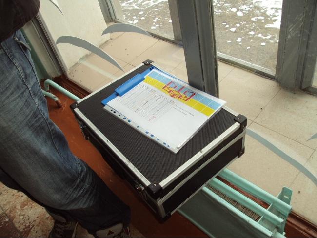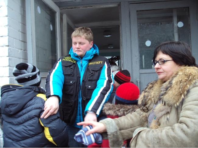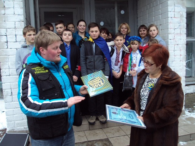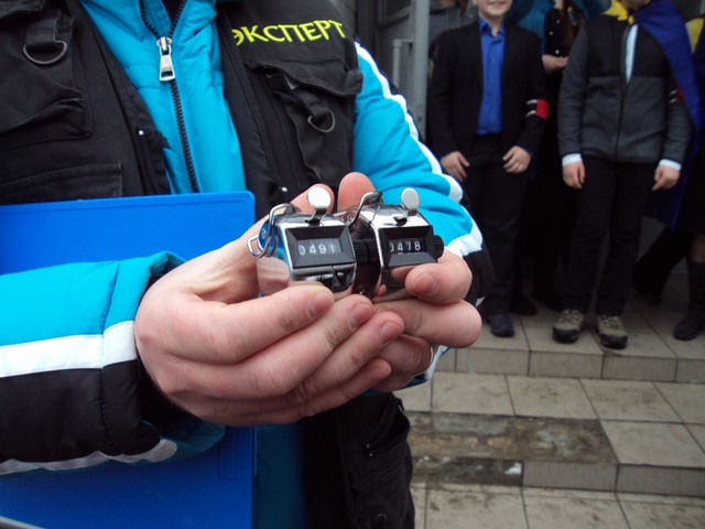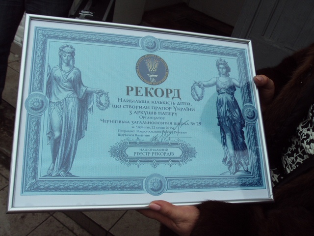 В руках у меня было два счетчика, которыми пользуются стюардессы в самолете, когда считают пассажиров. Ручной счетчик называется. При одном нажатии отсчитывается один человек. Дети заходили в школу двумя колонами, у меня в обеих руках были счетчики и мне нужно было только вести подсчет. Общая сумма - 969 человек. Детей очень сложно построить и поставить правильно. Но организаторам это удалось. Национальный рекорд официально установлен. Рекорд именуется следующим образом: "Самое большое количество детей, создавших флаг Украины листами бумаги".