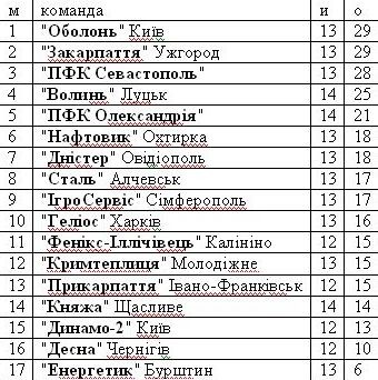 Перша ліга. Турнірна таблиця станом на 20 жовтня