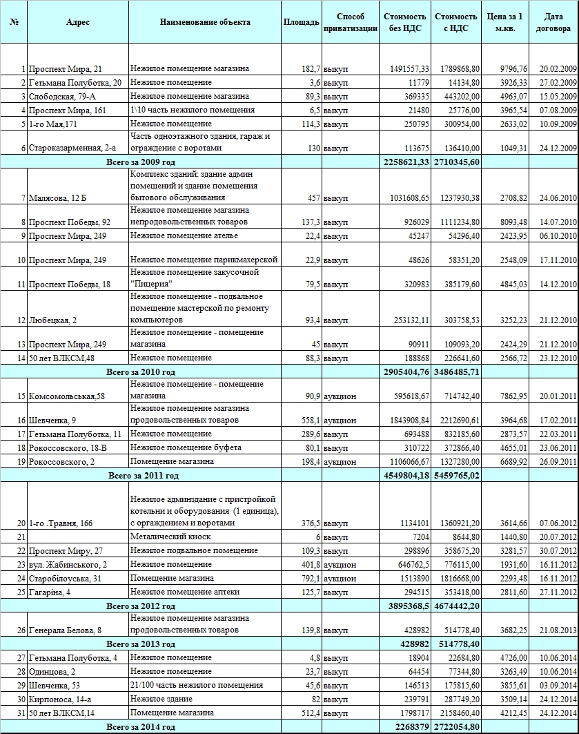 Дли информативности, ниже представлен перечень объектов недвижимого имущества, приватизированного в 2009-2014 годах: