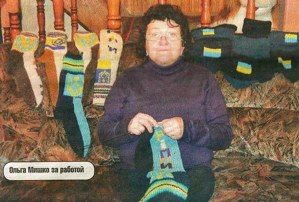 57-летняя пенсионерка Ольга Мишко из Репок вяжет носки, шарфы-воротники, гетры (накладка под голенище обуви) для бойцов. Не однотонные, а с яркой символикой. Ольга Евгеньевна вывязывает гербы, сине-желтые флаги, слова «Ріпки», «Україна». Уже связала 15 пар носков, 15 шарфов-воротников и три пары гетров.