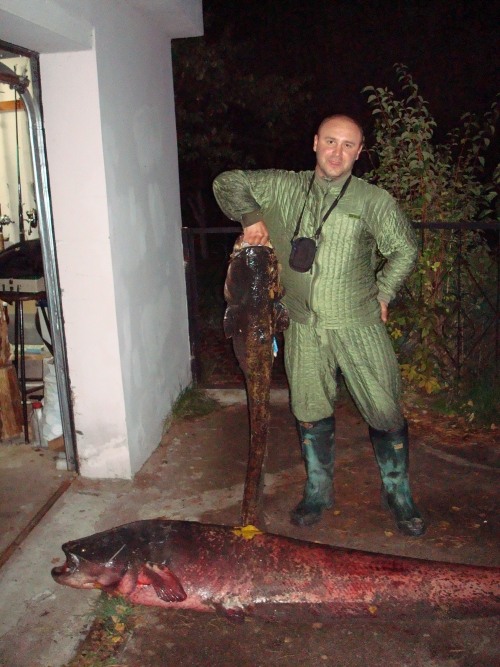 Немного успокоившись, рыбаки опять выехали на яму. Удача подняла настроение всем рыбакам. Не прошло и получаса, как Игорь почувствовал новый удар. Первое ощущение — зацеп. Но мононить стала натягиваться. Развернув лодку, чтобы не оборвать нить, Игорь попытался приподнять блесну, но рыба потянула в сторону ямы. Началась борьба, которая длилась почти три часа. Попытки подтянуть ближе к лодке или берегу сом пресекал рывками и движением ко дну. Приходилось все время быть начеку, руками мягко тормозить катушку, не давать резко натягиваться мононити. Шло время, хищник не хотел сдаваться, повторяя свои уловки и пытаясь перехитрить рыбака. Уже устали руки, слегка дрожали ноги, только спортивный азарт добавлял силы и терпения. Прошло более полутора часов, и рыба стала понемногу сдавать позиции. Но успокаиваться рано, рыба могла в любой момент продолжить борьбу. И наконец рыба на берегу. Хотите верьте, хотите нет, а вес сома — 59 килограммов, да и размер превышает средний рост человека. Вот это рыбацкое счастье!