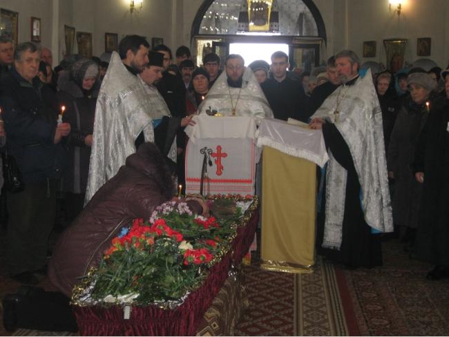 Панихида состоялась в 11 часов в Екатерининской церкви Чернигова. Проводить в последний путь Героя пришли родные, друзья, боевые товарищи, артисты Черниговского областного филармонического центра, общественность города. Желающих отдать дань памяти нашему защитнику в этот день, казалось, было  бесчисленное количество.  – Несмотря на свой возраст, Женя был настоящим мужиком. Погиб как герой. Погиб на боевом посту. Погиб за Украину,  –  в этот день сослуживцы Евгения немногословны, чувствуется, что слова им даются с трудом, потому  слова  глушат  слезы. Многие из военнослужащих пришли проститься с Женей прямо из военного госпиталя, где они находятся на лечении после получения ранений в боях за Углегорск.
