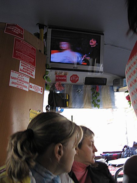 Видео с DVD - проигрывателя транслируется на экран монитора, подвешенного справа от места водителя. Интересно, повлияет это на безопасность движения, если водителю приходится еще и «перематывать» «неинтересных» исполнителей?