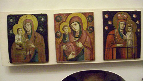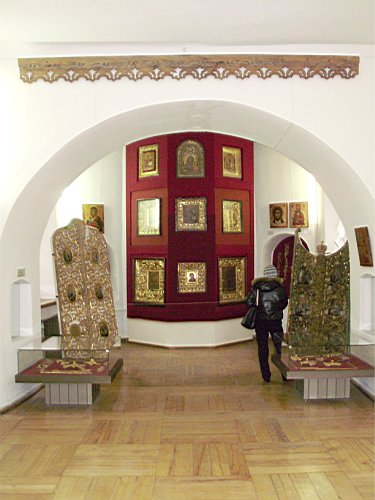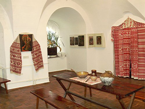 Следующий зал — «Народная икона». Здесь собраны иконы, выполненные непрофессиональными художниками 17-18 веков. Изображали умельцы в основном святых, покровителей различных ремесел, привнося свое видение жизни. Заметны диспропорции в изображении образов. Такие иконы продавали в то время на базарах, экспонируется также глиняная посуда, домашняя утварь того времени.