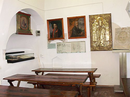 Коллегиум являлся одной из первых светских школ Левобережной Украины, поэтому завершает экспозицию «учебный класс». Школьные столы, плакаты, создают атмосферу того времени. В углу класса закладная доска Коллегиума (1700 год), найденная в 1953 году во время ремонтно-реставрационных работ. Читаю надпись: «Сей храм создан Божиим благословением и прещедрым даянием и иждевением от ясне вельможного пана Иоана Мазепы славного войск российских гетьмана. Над тысяща в семисотном року здать начался и втором поспишеством Божии скончался». В центре плиты — герб Мазепы.