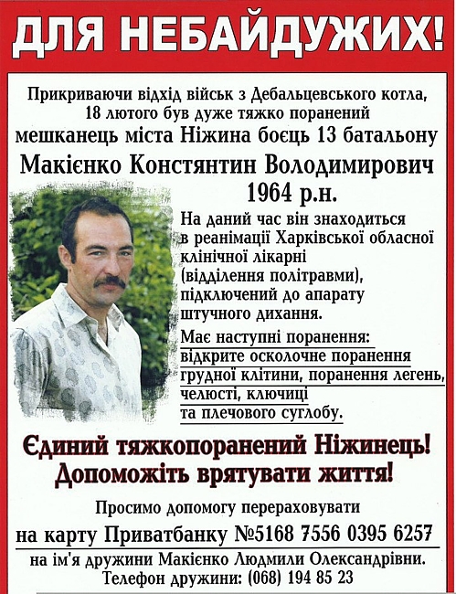Бойцу 13-го батальона срочно нужна ваша помощь. Нежинец Константин Макиенко был тяжело ранен под Дебальцево.