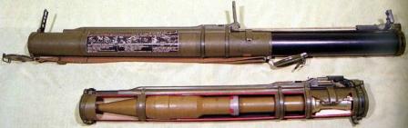 Реактивная противотанковая маната РПГ-18, сверху в боевом положении, снизу - разрезной макет в походном положении.