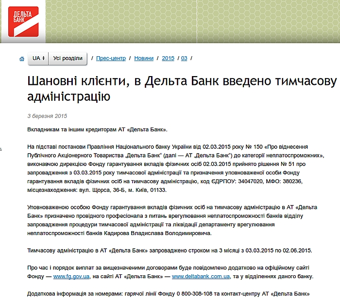 03.03.2015. Дельту оголосили несплатопроможним! Фонд гарантування вкладників взяв його на баланс.