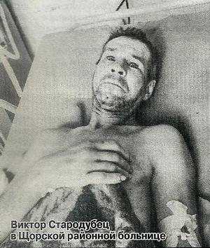 Он вернулся белый как стена. Говорит: звони председателю села, пусть вызывает милицию — в доме квартирантки лежит на полу в луже крови Витя Стародубец. И она в той же комнате (благо, муж у меня высокий — стал на скамейку во дворе и всё рассмотрел) мечется туда-сюда. Свет то включит, то выключит.