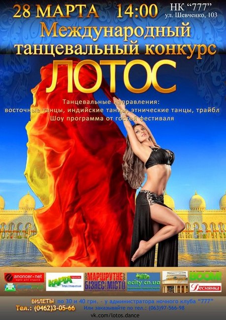 ИНТЕРЕСНО 28 марта 2015г. в 14:00 в ночном клубе "777", по ул. ул. Шевченко, 103, на самом большом танцполе Чернигова, состоится долгожданное яркое и чарующее событие - Международный конкурс-фестиваль по танцам "Лотос"!