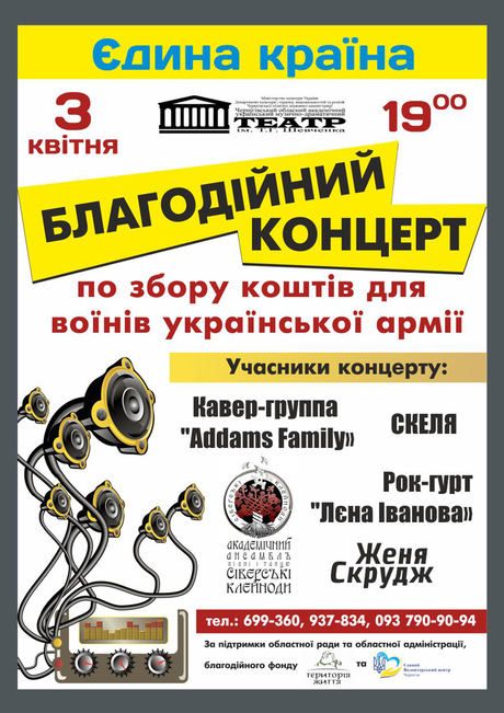 Мета заходу – збір коштів для Чернігівських батальйонів територіальної оборони. Організатор - Благодійний фонд «Територія життя» за підтримки обласної адміністрації та обласної ради. Учасники концерту: гурт "Скеля", кавер-гурт "Addams family", рок-гурт "Лєна Іванова", Женя Скрудж та фолк- рок у виконанні Академічного ансамблю пісні і танцю "Сіверські клейноди"