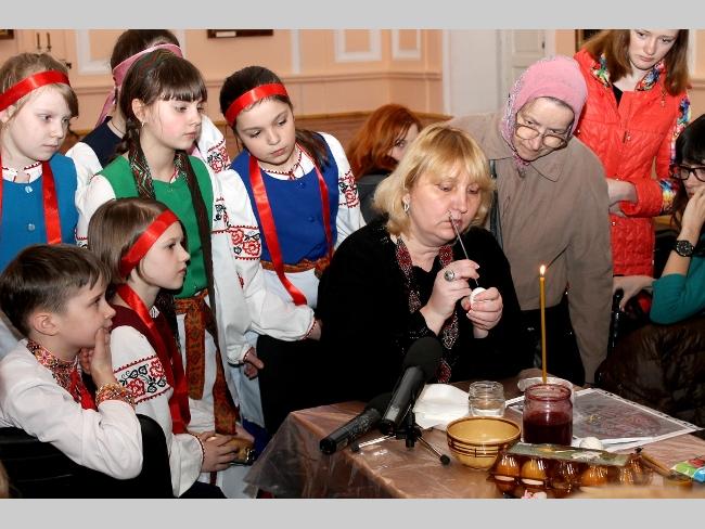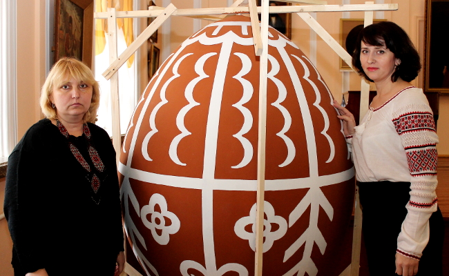 Ведущий методист по развитию народных ремесел Яна Погребнюк и преподаватель Татьяна Стадниченко Центра народных ремесел для детей и юношества расписали полутораметровую писанку в традициях присущих Черниговскому региону.