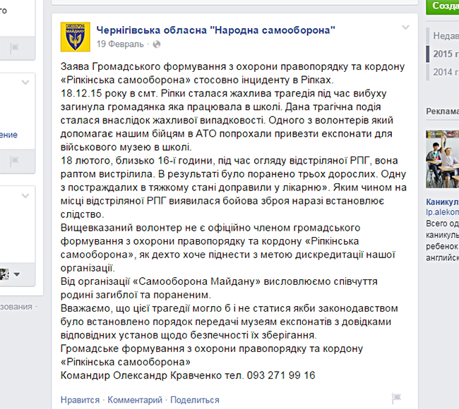 В то же время Александр Потебенько, и.о. командира Добровольческого батальона «ОУН», который по поручению бойцов и офицеров, очевидцев событий в Песках 17.02.2015 г. написал пояснительную записку, считает, что все происшедшее – трагедия и несчастный случай.
