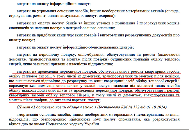 Кабинет министров Постановлением №532 от 1.10 2014 внес изменения в п.61 Постановления КМУ №869 "Про забезпечення єдиного підходу до формування тарифів на житлово-комунальні послуги" которым определил, что поверка квартирных счетчиков тепла проводится теплоснабжающими организациями за свой счет и ложится непостредственно на сбыт услуг по теплоснабжению. Также на затраты по сбыту тепла ложится и поверка домовых приборов учета тепла, в случае, если приборы являются собственностью предприятия.