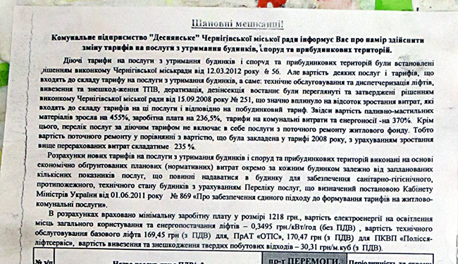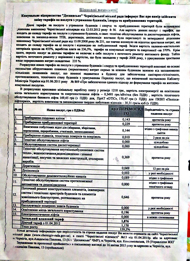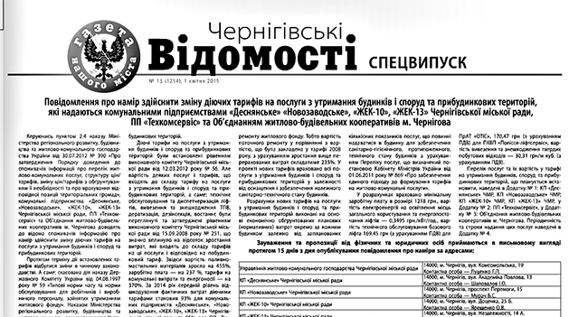 Все жители города начали активное обсуждение стоимости проезда в общественном транспорте, но мало кто обратил внимание на публикацию в «Черниговских ведомостях» Извещения о намерении изменения действующих тарифов на услуги по содержанию домов, сооружений и придомовых территорий. Новые тарифы жителям Чернигова предлагают КП «Деснянское», КП «Новозаводское», КП «ЖЭК-10», КП «ЖЭК-13» Черниговского горсовета, а также ЧП «Техкомсервис» и ОЖСК.