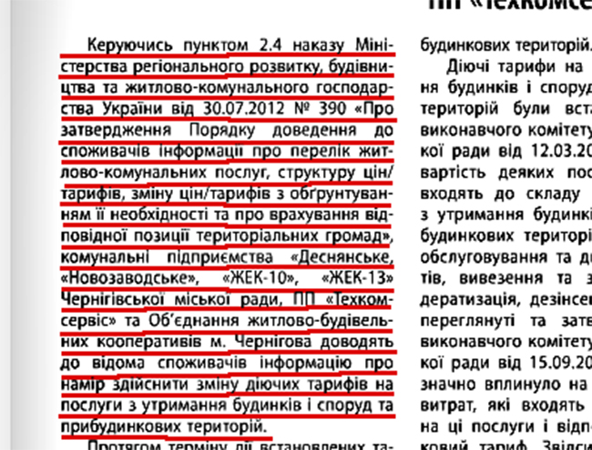 На основании приказа Минрегионбуд №390 от 30.07.2012 «Про затвердження Порядку доведення до споживачів інформації про перелік житлово-комунальних послуг, структуру цін/тарифів, зміну цін/тарифів з обґрунтуванням її необхідності та про врахування відповідної позиції територіальних громад» просим руководителей КП «Деснянское», КП «Новозаводское», КП «ЖЭК-10», КП «ЖЭК-13» Черниговского горсовета, а также ЧП «Техкомсервис» и ОЖСК рассматривать данную публикацию, как замечания и предложения к Извещению о намерении изменения действующих тарифов на услуги по содержанию домов, сооружений и придомовых территорий. Просим зарегистрировать данные замечания и рассмотреть в установленном законом порядке. О дате и времени рассмотрения замечаний и предложений просим проинформировать по номеру редакции сайта gorod.cn.ua тел .651-800