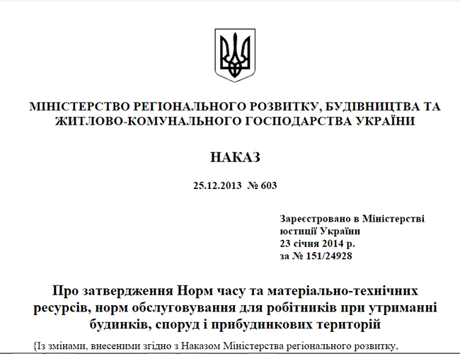 В самом начале своего Извещения о намерениях ЖЭКи сообщили, что Минрегионбуд своим приказом №603 25 декабря 2013 года изменил нормы времени и материально-технических ресурсов, нормы обслуживания для рабочих при содержании зданий, сооружений и придомовых территорий. Эти нормы обязательны для выполнения предприятиями всех форм собственности, которые оказывают ЖКУ.