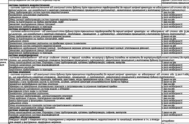 Не лучше обстоят дела и с техническим обслуживанием домовых систем холодного и горячего водоснабжения и отопления. Тут наши коммунальщики умудрились не только урезать периодичность обслуживания, но и ввести такое понятие как «в случае необходимости», которое, как мы понимаем, следует читать «в случае аварии». А это, естественно, приведет к подтапливанию зданий и разрушению несущих конструкций.