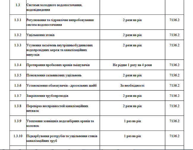 Для примера, уплотнение сгонов требуется проводить 2 раза в год. В Чернигове предлагают «по мере необходимости». Устранение засорений в системе водопровода и канализации рекомендовано не реже 2 раз в году. У нас канализацию будут чистить в случае необходимости, и, нужно понимать, за счет совершенно другой статьи расходов – аварийных работ. Про прочистку систем водоснабжения в Чернигове вообще речь не идет!