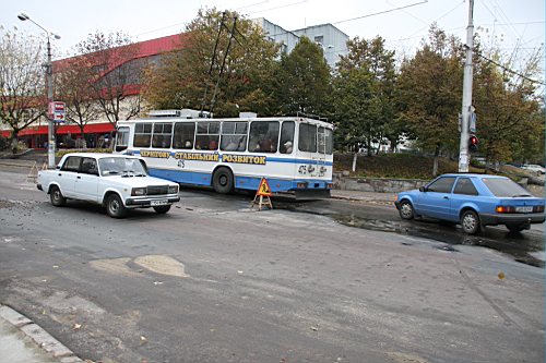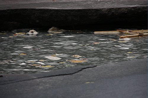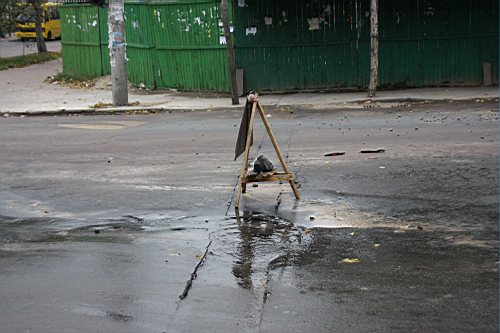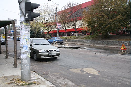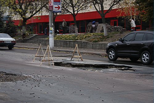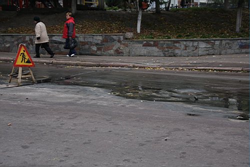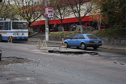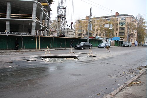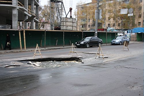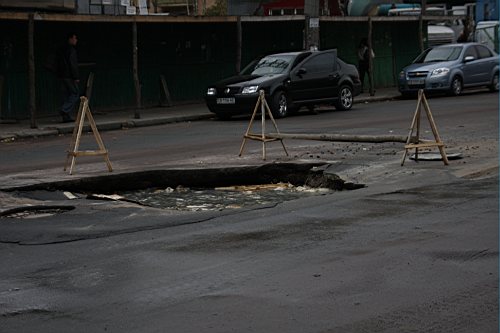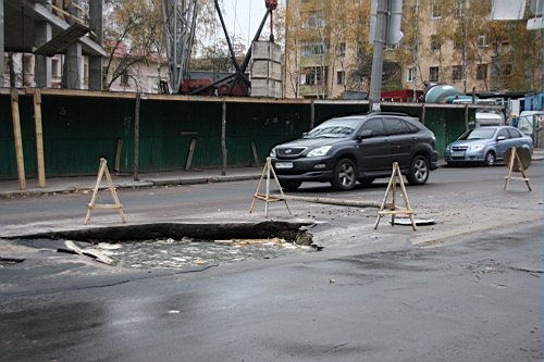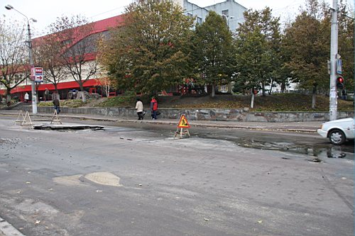 Вчера утром, 31-го октября наш фотокорреспондент побывал на улице Киевской. Дорожное полотно возле строящейся новой гостиницы и супермаркета "Пятницкий" покрылось трещинами. Куски асфальта провалились под землю, а из образовавшихся дыр хлестала вода.