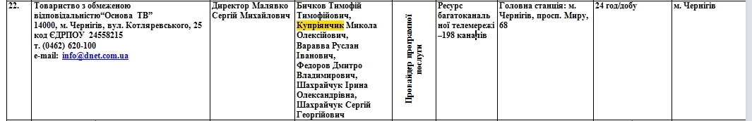 Чуть позже из наших источников выяснилось, что Николай Куприянчик работал на предприятии ВАТ "ЧЕРНІГІВСЬКИЙ КОМБІНАТ ХЛІБОПРОДУКТІВ", а также на некой фирме, что занимается зерном и имеет отношение к одному из народных депутатов - Владиславу Атрошенко. А также он значился в 2010-м году в числе остнователей ЗАО ТРК "Детинец", а в 2012-м и 2015-м - “Основа ТВ” - источник: http://www.nrada.gov.ua/ua/13720.html, оба этих предприятия, как известно, имеют самое прямое отношение к напродному депутату.