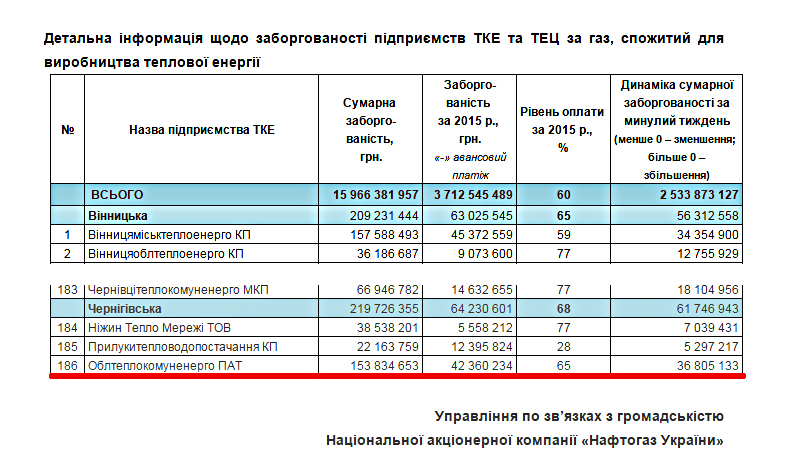 В то же время 15 апреля НАК «Нафтогаз» заявил, что ПАО «Облтеплокоммунэнерго» в 2015 году оплачивало потребленный газ только на 65%. При этом задолженность за 2015 год превышает 43 млн. грн., а общая задолженность предприятия – свыше 153 млн. грн.