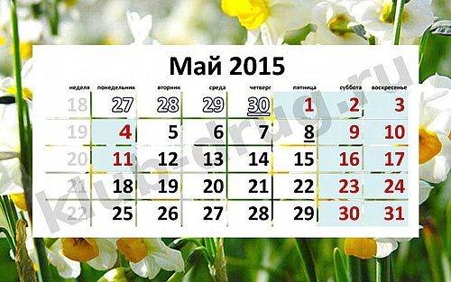 День Победы, 9 Мая, также будет в субботу. Поэтому получаем три выходные кряду — 9,10 и 11 мая.