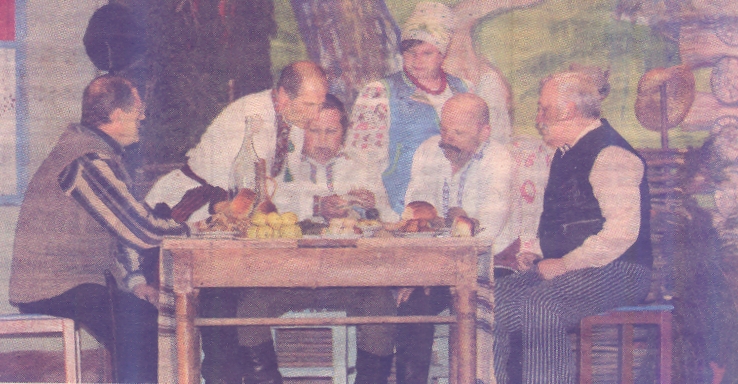— Щоб щипало, перець додають, травки різні, — усміхається Анатолій Маснуха, сокиринський сільський голова, котрий зіграв у спектаклі волосного писаря. — Після вистави й ми випили тієї, що за язик щипає, — продовжує. — Був пасхальний обід. Жінки принесли м'ясо, холодець, огірочки, паски, спечені в печах.