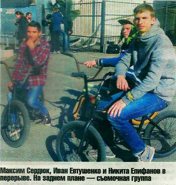 — Пару дней назад, когда мы катались на великах, ко мне подошел Миша из съемочной группы. Предложил сняться. Через пару дней встретились, — рассказывает 21-летний студент политеха Никита Епифанов, он снимается в сцене вместе с друзьями — 16-летним Иваном Евтушенко и 17-летним Максимом Сердюком. — Сколько заплатят, не сказали. Мол, потом договоримся (в прошлый раз за съемки платили по десять долларов, в этот раз говорят, по 100 гривен. — Авт.)