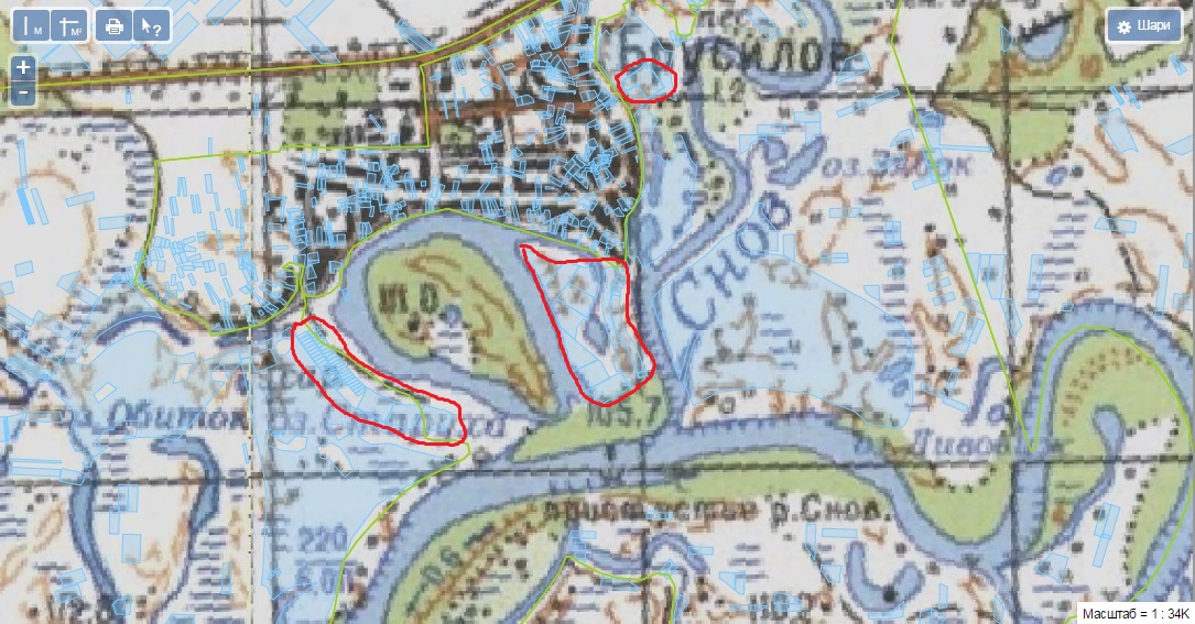 Знайти власників ділянок площею по 2 га – не вдалось. Але по семи з них, у 2014 році Чернігівським окружним адміністративним судом було визнано недійсними накази «Про затвердження документації із землеустрою та надання земельних ділянок у власність». Позивачем виступала Чернігівська обласна прокуратура. Причина оскарження: земельні ділянки частково відносяться до земель водного фонду, через їх безпосередню близькість до води. Наприклад, водойма з місцевою назвою озеро Старуха (Кругле) є прирусловою водоймою річки Десна, прибережна захисна смуга якої становить 100 метрів. Відстань до води по деяких ділянках біля «Старухи» становила біля 50 метрів.
