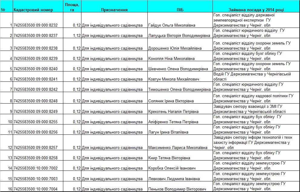 Питанням виділення решти ділянок дійсно займалось ГУ Держземагенства у Чернігівській області. Під час спроби ідентифікації осіб, які отримали землю ми виявили ряд співпадінь: прізвища ім’я та по батькові осіб повністю співпали з відповідними даними 16 осіб – працівників ГУ Держземагенства у Чернігівській області. Список працюючих в Управлінні, яким ми користувались доволі застарілий – за 2014 рік, але через те, що право власності на ділянки перейшло саме у 2014 році, він допоміг визначити працівників. Крім того, землю отримували і близькі родичі службовців Держземагенства.