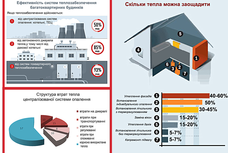 Доведено, що коефіцієнт корисної дії існуючої в Чернігові системи теплозабезпечення багатоквартирних будинків не перевищує 50%. Втрати тепла розпочинаються відразу на джерелі, продовжуються при його постачанні та використанні. Причому, без обліку тепла у багатоквартирних будівлях за всі втрати розплачується саме споживач! На діаграмі показано, за рахунок чого і скільки теплової енергії можна зекономити.