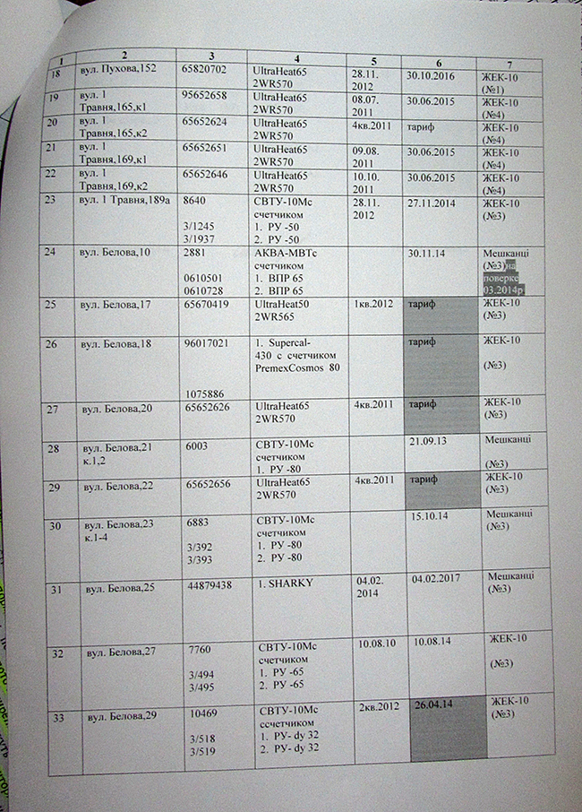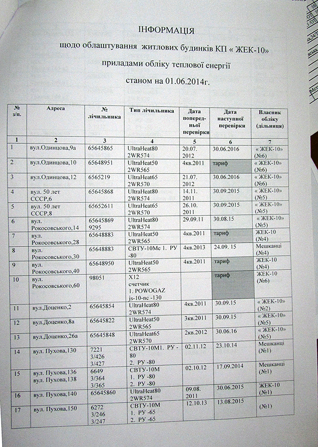 На фото: Информация по приборам учета тепла в домах, состоящих на обслуживании КП «ЖЭК-10»