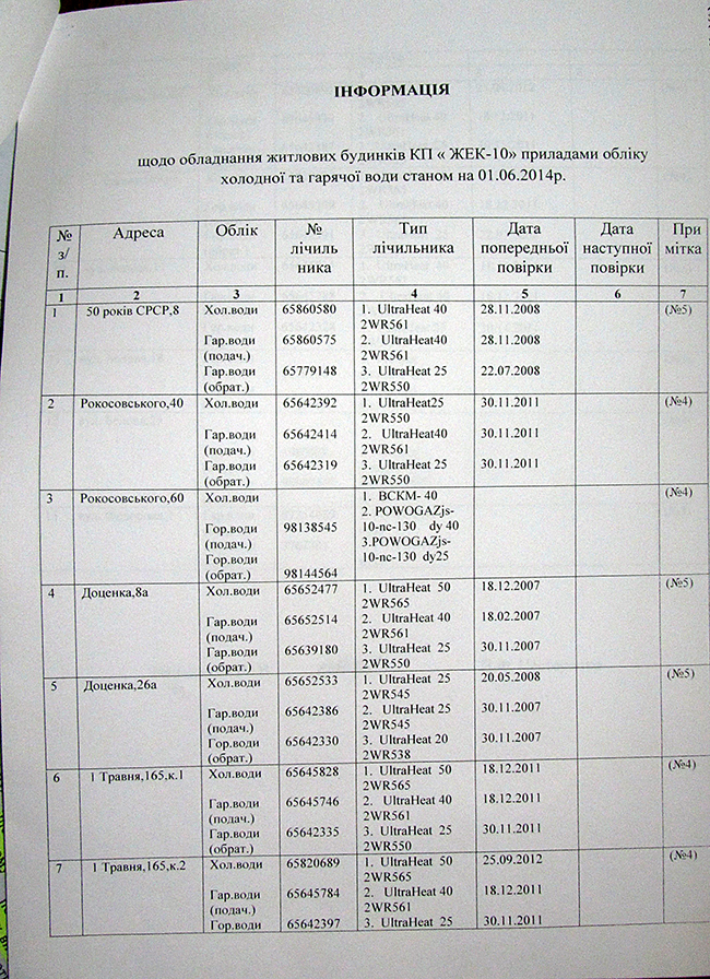 На фото: Информация по приборам учета горячей и холодной воды в домах, состоящих на обслуживании КП «ЖЭК-10»