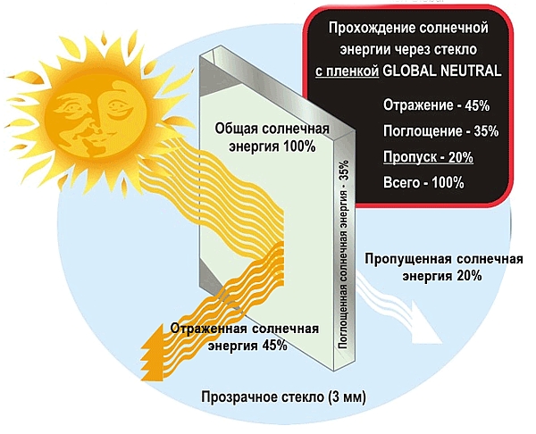 Наглядная схема прохождения солнечной энергии через стекло с пленкой