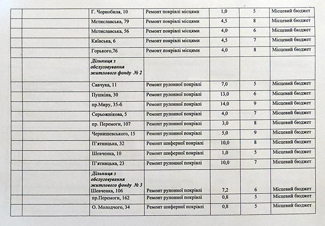 Через пару минут главный инженер Владимир Маринец все же принес документ, который Графиком подготовки к зиме даже сложно было назвать. При беглом просмотре этого плана хотелось плакать. На балансе у предприятия – 561 здание. Из них в план включили только 124 объекта выделив на ремонт 189 тыс грн. То есть к зиме планировали готовить только 22% зданий жилищного фонда, обслуживаемого предприятием! Тем не менее, этот График выдавали за серьезный документ, по которому будут оценивать уровень подготовки жилищного фонда к зиме. В среднем, на ремонт одного здания планировалось 1474 грн 11 коп. Но было очень много зданий, для которых КП «Деснянское» запланировало на проведение ремонта по 150-300 грн!