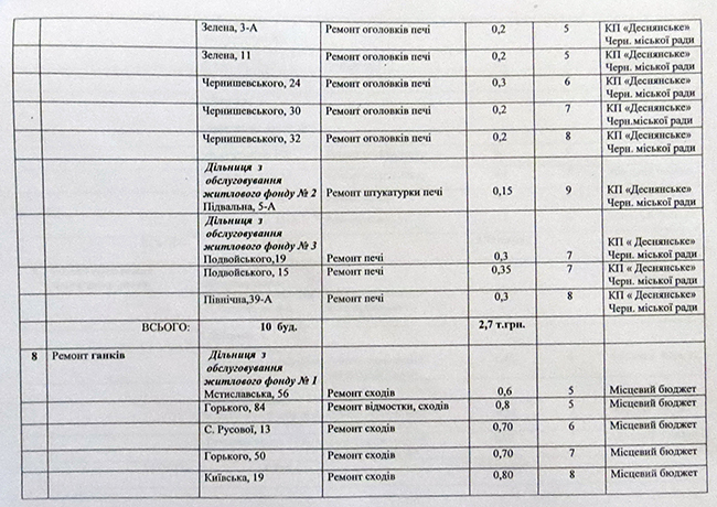 На самом деле в График ремонтных работ жилищно-коммунальных объектов по КП «Деснянское» Черниговского городского совета для подготовки к эксплуатации в осенне-зимний период 2015-2016 годов попало всего 124 здания. Как будут «готовить к зиме» остальные 437 зданий – остается загадкой! Но, мы уверены, что даже, несмотря на бездеятельность коммунальщиков, городской голова Александр Соколов осенью этого года в очередной раз проведет прекрасный пресс-тур, в ходе которого журналистам расскажут, как самоотверженно ЖЭКи преодолевали все возникшие перед ними трудности.
