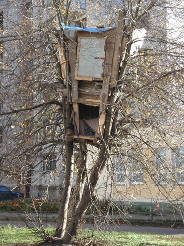 Этим летом Влад и Андрей соорудили себе «гнездышко» на дереве, чтоб не каждый влез. Нормальные парни, 14—16 лет, учатся в школе, но после уроков влезают по веткам дерева на «первый этаж», потом — на второй. Внутри уютно, обито ковриками, сидят, иногда играют в карты, в другой раз беседуют — о чем, посторонним неизвестно, на то оно и есть собственное пространство.