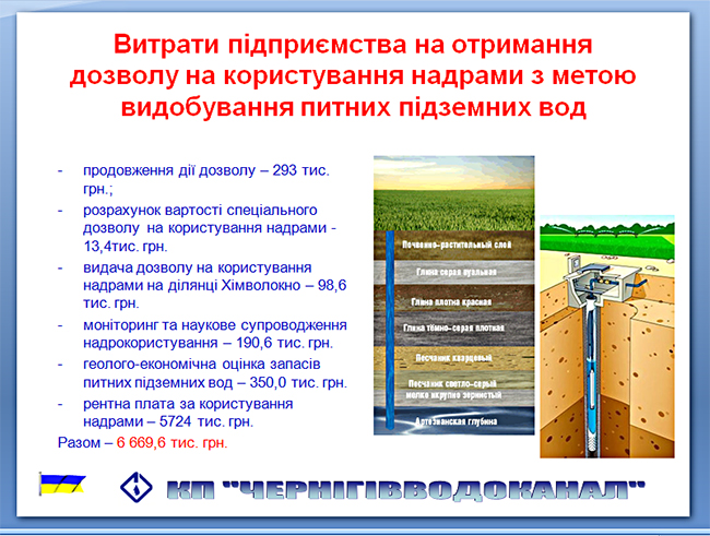 Сегодня водоснабжение Чернигова осуществляется с пяти основных водозаборов. Вода берется из артезианских скважин глубиной до 800 метров. Дополнительно к существующим водозаборам в прошлом году предприятию передали водозабор, расположенный на территории «Химволокно». С этим водозабором у «Черниговводоканала» остается большое количество проблем. По словам А.Шкиня, очень сложной является разрешительная система. И самое главное – экономика вопроса: из этого водозабора предприятие выкачивает воды на 1,5 млн. грн в год, но при этом затраты составляют до 3 млн. грн!