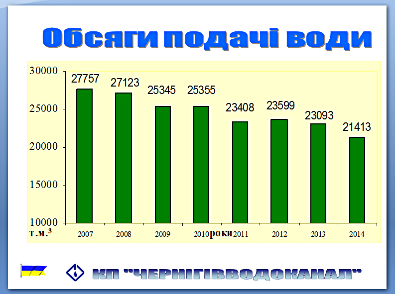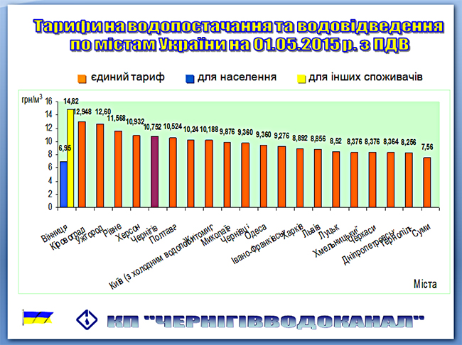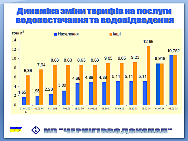 Все вышеперечисленные факторы повлияли на формирование тарифов по водоснабжению и водоотводу в Чернигове. На сегодняшний день КП «Черниговодоканал» предоставляет услугу по цене, которая по своему уровню – на пятом месте среди областных центров Украины.
