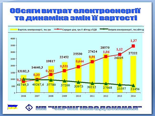 Несмотря на то, что предприятие смогло кардинально уменьшить потребление электроэнергии на подъем и подачу воды и при отводе стоков за счет приобретения и установки энергоэффективного оборудования, уменьшить затраты по электроэнергии в денежном эквиваленте не получается из-за постоянного роста цены электроэнергии.